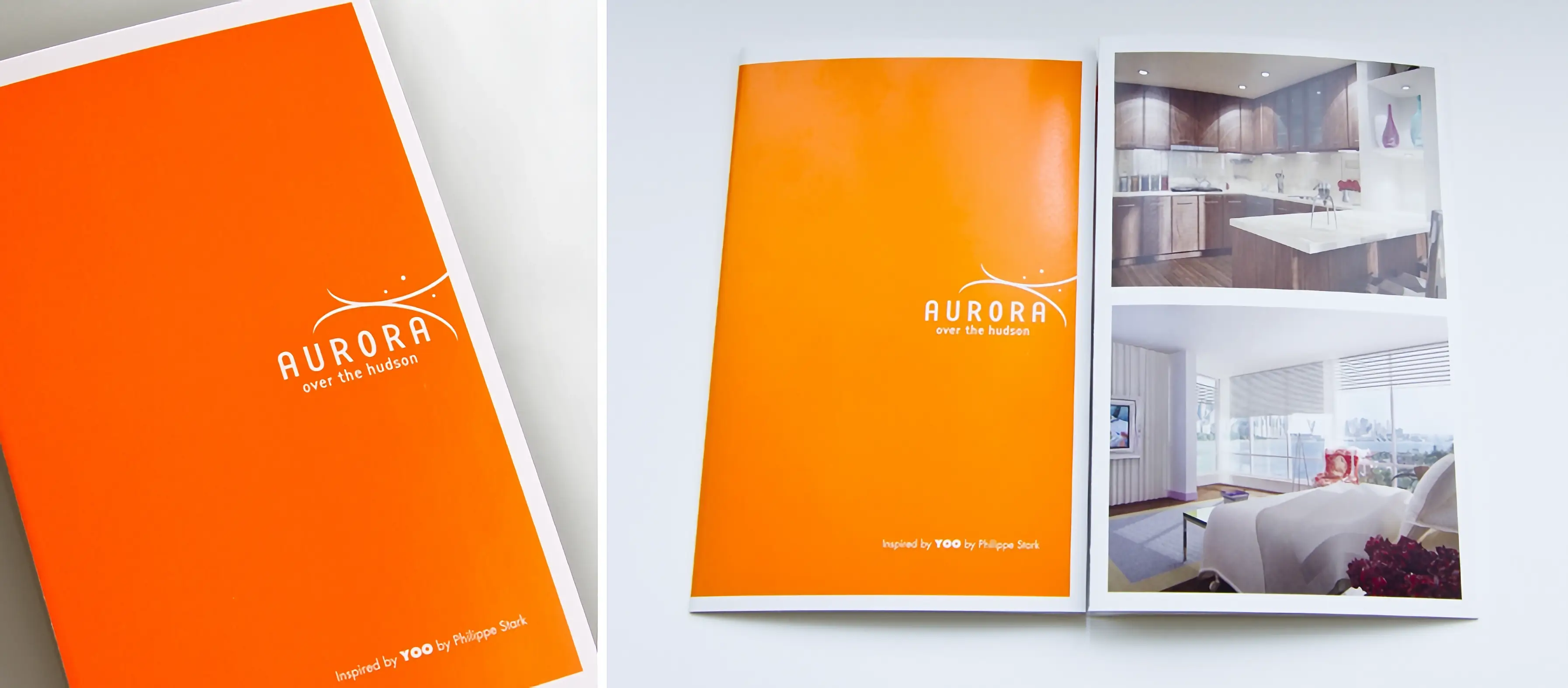 Direct mailer design for a high-end residential development, created to communicate exclusivity, sophistication, and lifestyle appeal. The piece combines bold color, clear typography, and panoramic photography to showcase interiors, amenities, and views in an editorial, magazine-like format.